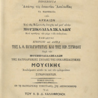 Σπάνια παρτιτούρα βυζαντινής μουσικής. Πρόκειται για τη μοναδική έκδοση, μάλιστα ελλειπή, του αργού στιχηρακικού αναστασιματαρίου και γι' αυτό κρίνεται ως έκδοση από τις σπουδαιότερες. Εξάλλου, ο πρόλογός του (αποδίδεται στον Θεόδωρο Αριστοκλέα) είναι από τα σημαντικότερα κείμενα του ιθ' αιώνα, τα σχετικά με την προέλευση και την ιστορική εξέλιξη της βυζαντινής μουσικής. Ο πρόλογος αυτός κυκλοφόρησε και σε ιδιαίτερο φυλλάδιο. Πλήρης τίτλος: "Μουσική βιβλιοθήκη : διηρημένη εις τόμους και περιέχουσα απάσης της ενιαυσίου Ακολουθίας τα μαθήματα των αρχαίων επί της Βυζαντινής εποχής μετ'αυτήν μουσικοδιδασκάλων".