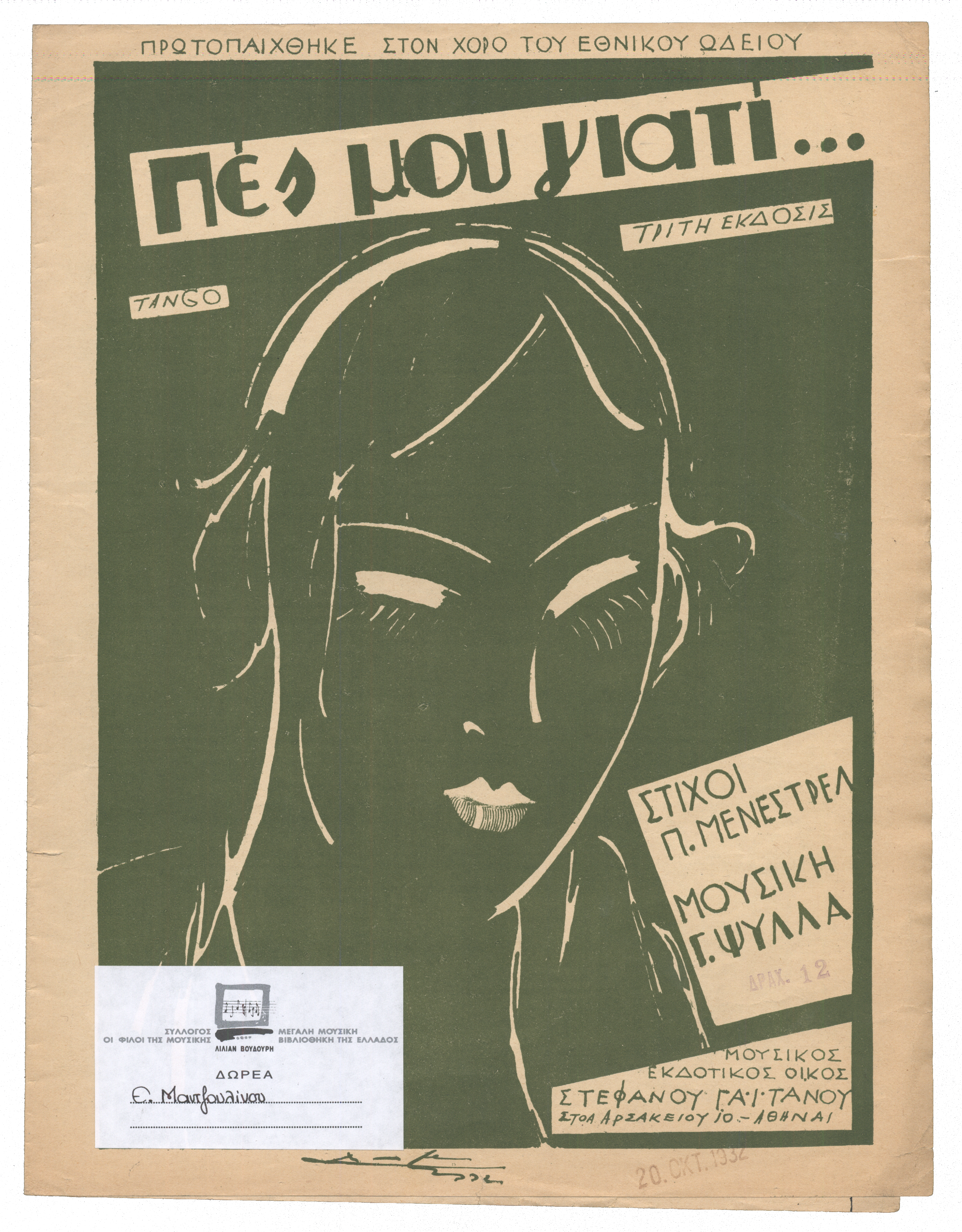 Tango (Το τραγούδι είναι 3η έκδοσις και υπάρχει σε δύο αντίτυπα) Πρωτοπαίχθηκε στον χορό του Εθνικού Ωδείου