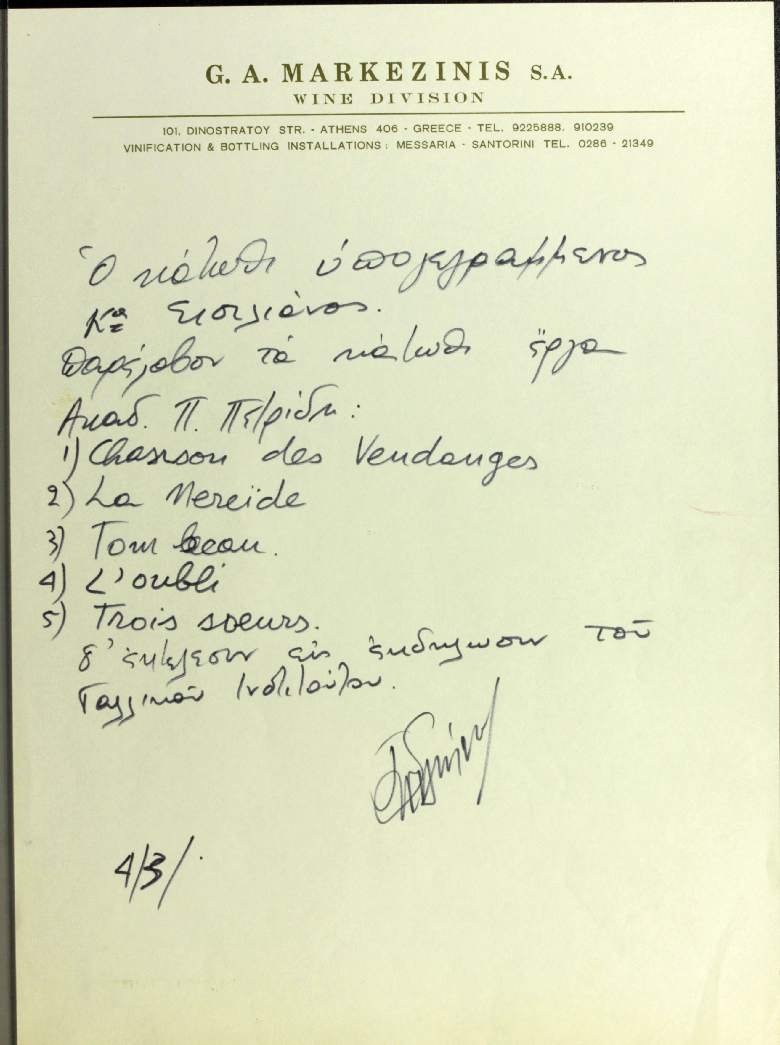 Χειρόγραφη δήλωση παραλαβής υλικού του Π. Πετρίδη, από τον Σισιλιάνο με σκοπό εκτέλεση εκδήλωσης του Γαλλικού Ινστιτούτου