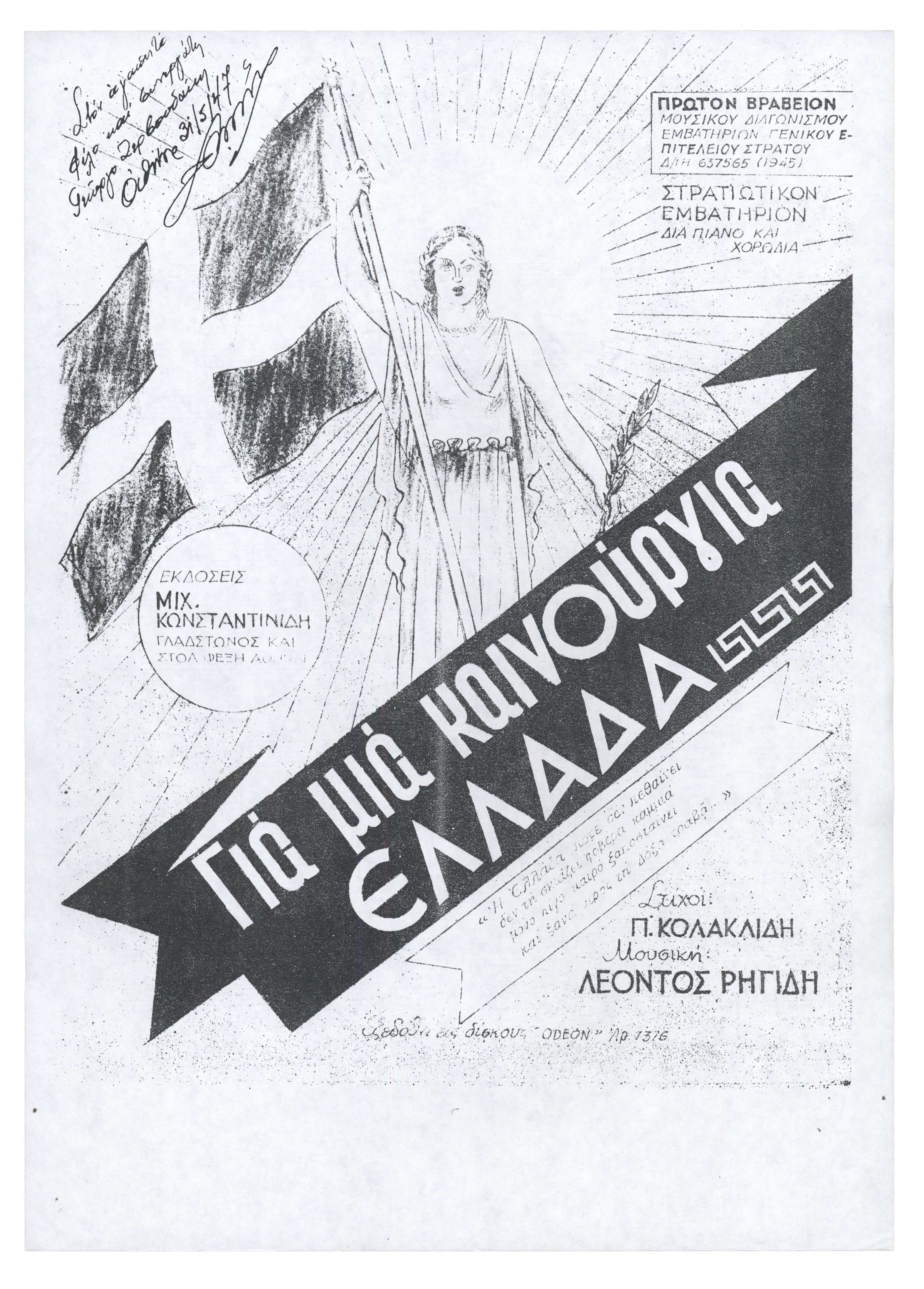 Φέρει την υπογραφή του συνθέτη / Φρέτσας, Ριχάρδο (χαράκτης) / Ενοργάνωσις δια Στρ. Μουσίκας, Λοχαγού αρχιμουσικού Μ. Καστέλλη / Φωτοτυπημένο έντυπο